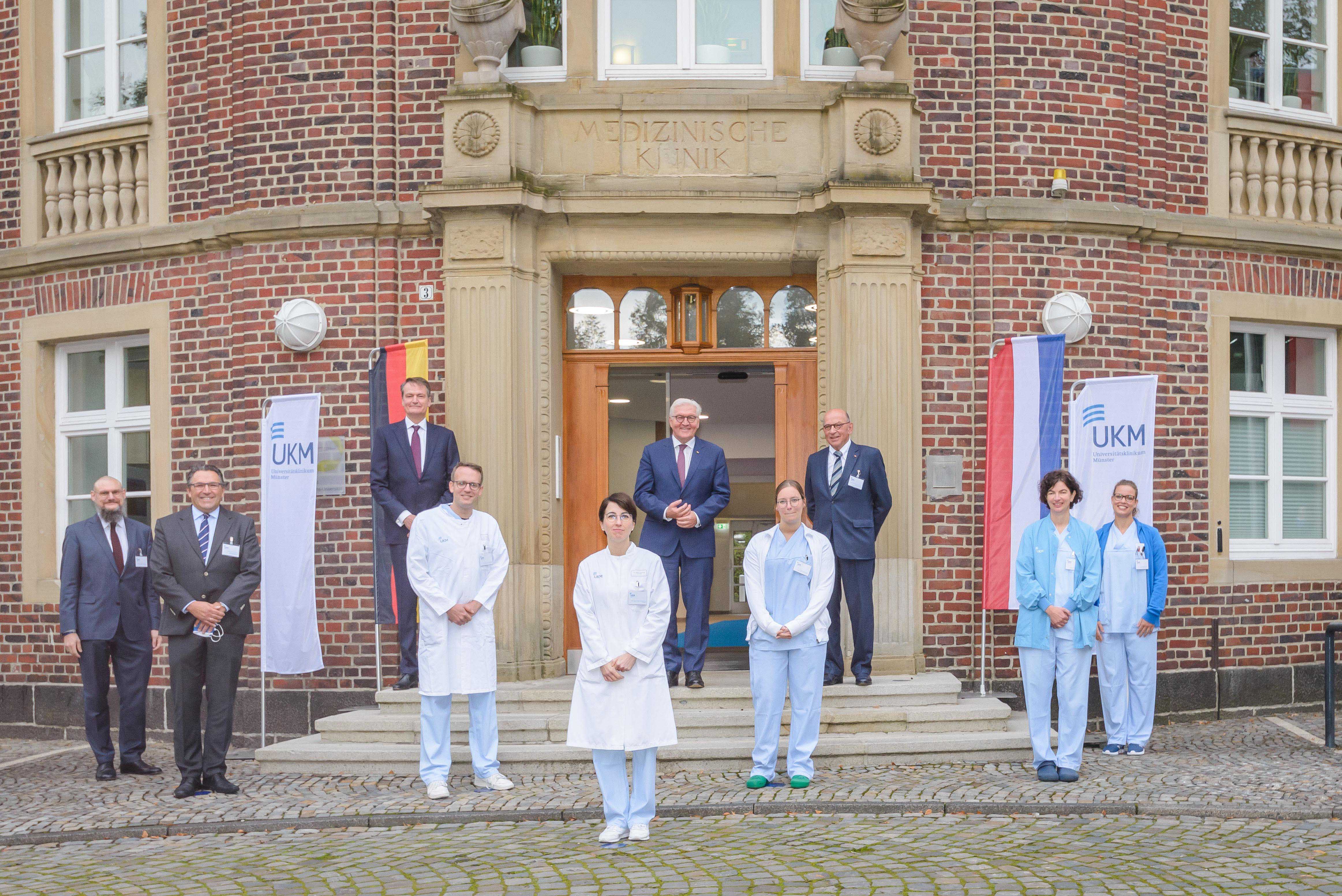 Im Dekanatsgebäude sprach Bundespräsident Steinmeier mit Ärzten und Pflegekräften, die unter anderem auch die niederländischen Covid-19-Patienten am UKM betreut hatten. Der Bundespräsident bedankte sich für ihren Einsatz: „Die Corona-Pandemie verlangt allen Menschen viel ab. Auf der ganzen Welt beklagen wir Tausende von Opfern. Deutschland ist in der medizinischen Versorgung von Covid-19-Patienten hervorragend aufgestellt. Unseren europäischen Nachbarn Hilfe anzubieten, als sie stark mit hohen Patientenzahlen belastet waren, war vor diesem Hintergrund eine menschliche Pflicht. Die nordrhein-westfälischen Krankenhäuser haben die von den Niederländern erbetene Unterstützung gewährt und das UKM hat diese ko-ordiniert. Dass das vollkommen unbürokratisch gelöst wurde, ehrt alle Be-teiligten.“